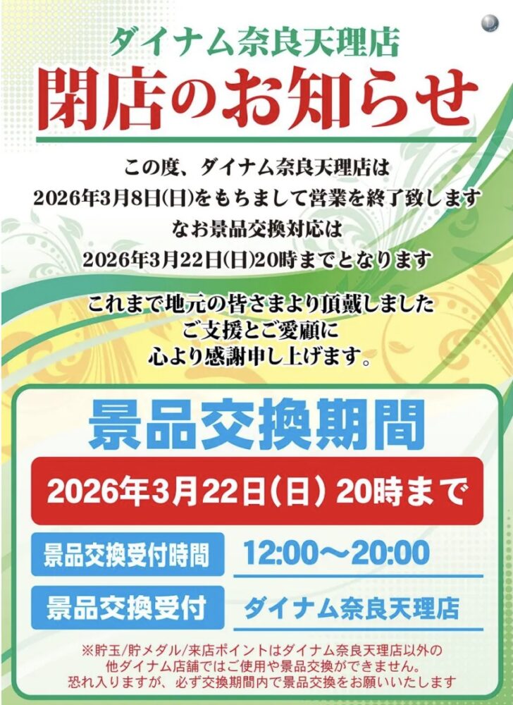 【閉店】奈良県天理市にあるパチンコ店『ダイナム奈良天理店』が2026年3月8日をもって閉店