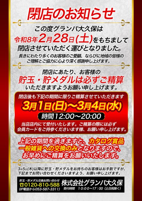 【閉店】東京都新宿区にあるパチンコ店『グランパ大久保店』が急遽閉店