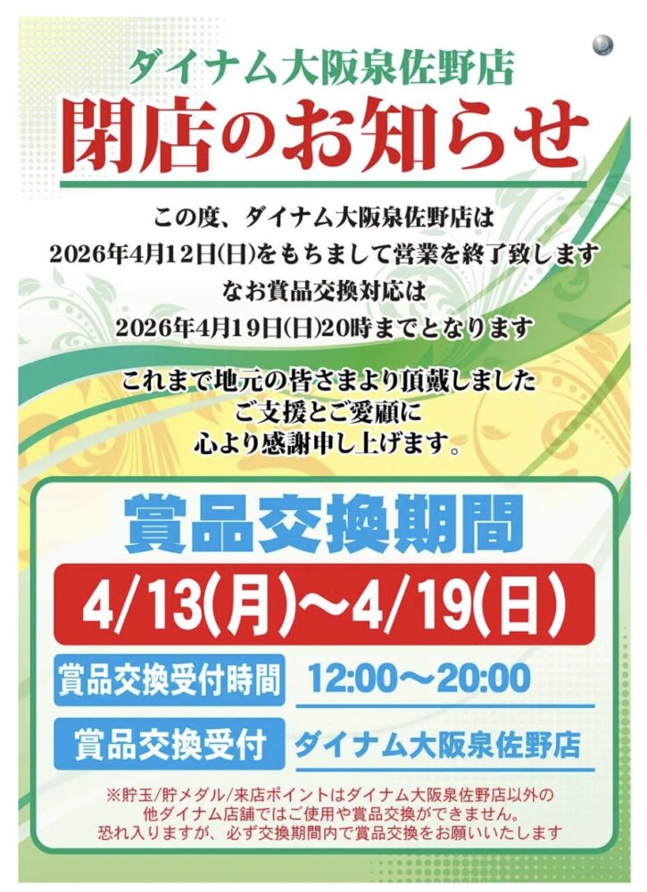 【閉店】大阪府泉佐野市にあるパチンコ店『ダイナム大阪泉佐野店』が、2026年4月12日をもって閉店