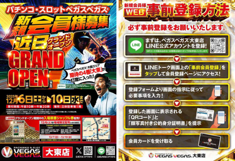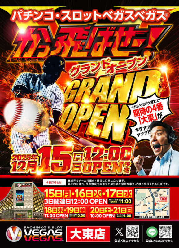 【いよいよ!】大阪府大東市のパチンコ店「ベガスベガス大東店」が12/15にグランドオープン!