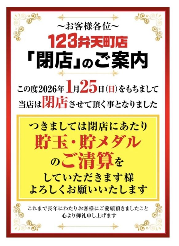 大阪市港区にあるパチンコ店『123弁天町店』が、2026年1月25日(日)をもって閉店することがホームページより告知されました。