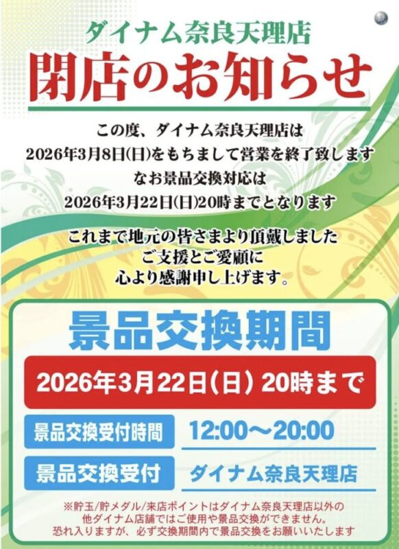 奈良県天理市にあるパチンコ店『ダイナム奈良天理店』が、2026年3月8日をもって休業となるようです。