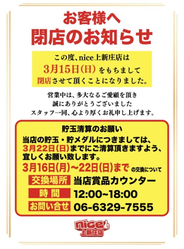 大阪市東淀川区にあるパチンコ店『nice上新庄店』が、2026年3月15日をもって閉店となるようです。