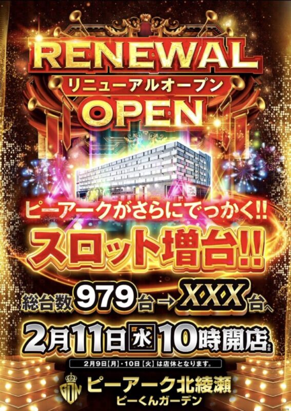 東京都足立区にあるパチンコ店『ピーアーク北綾瀬ピーくんガーデン』が、2026年2月11日よりスロットを増台しての営業となるようです!