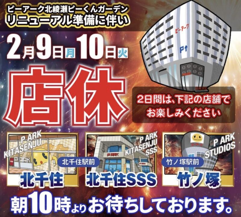 【店舗情報】東京都足立区のパチンコ店『ピーアーク北綾瀬ピーくんガーデン』が2日間の店休を経てリニューアル!スロット増台!