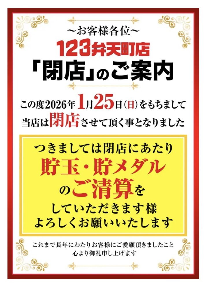 2026年1月16日 18時26分【閉店情報】2025年1月25日をもって、大阪市弁天町のパチンコ店『123弁天町店』が閉店